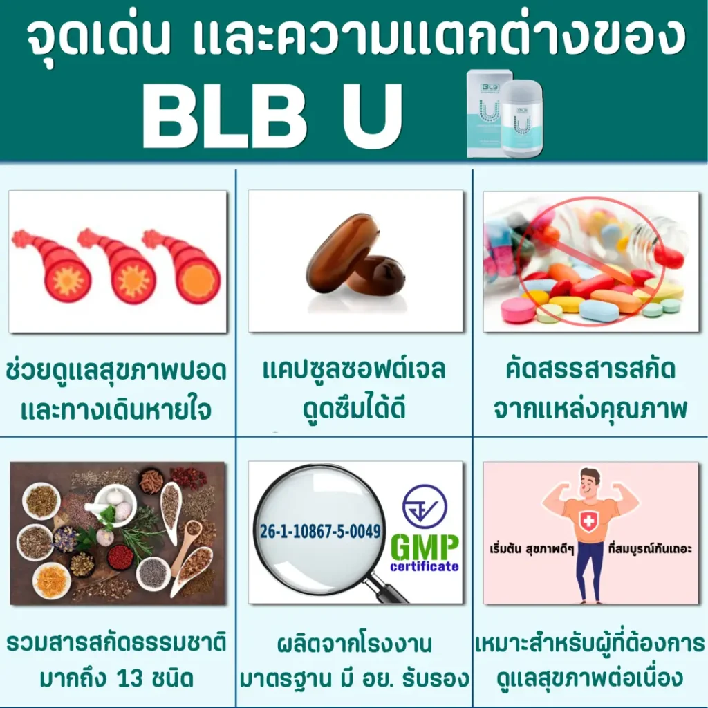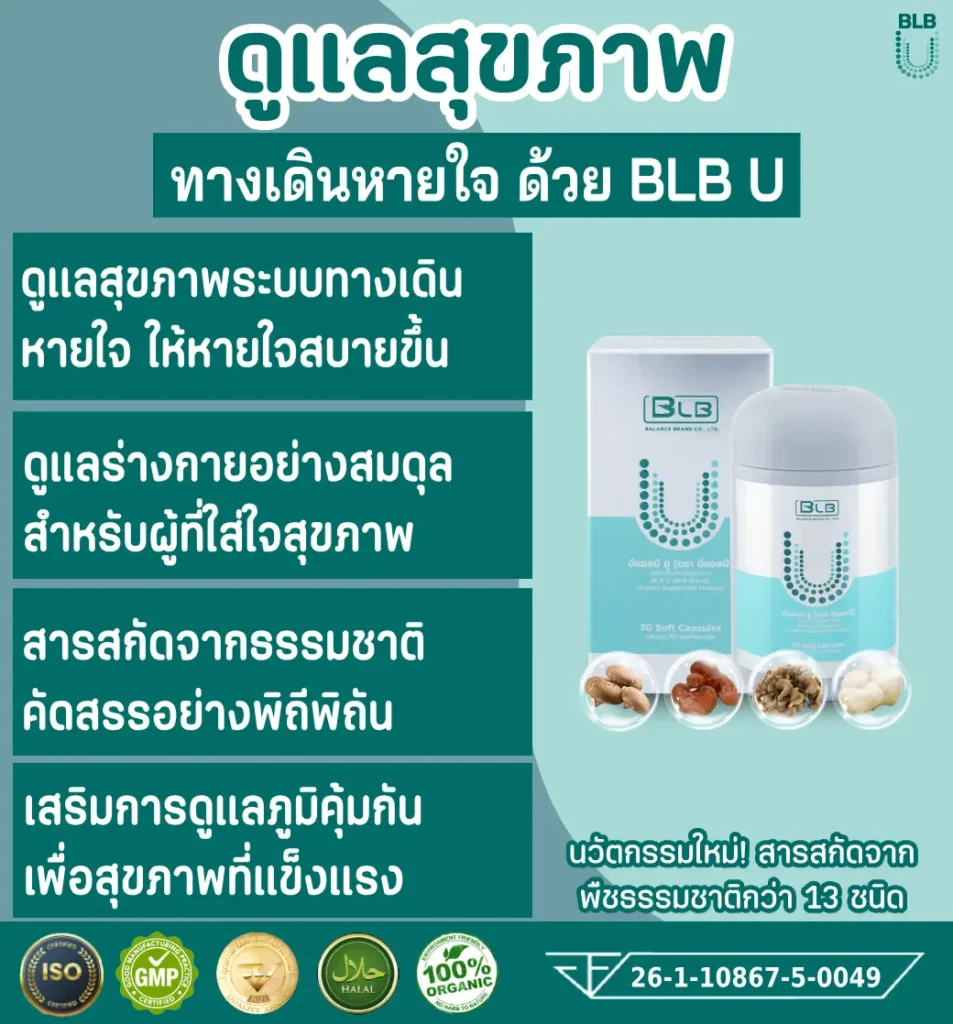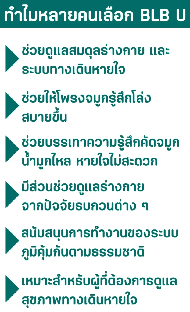 BLB U เป็นผลิตภัณฑ์จากสารสกัดธรรมชาติ 13 ชนิด ช่วยดูแลสุขภาพปอดและหลอดลม พร้อมเสริมการทำงานของระบบภูมิคุ้มกัน เหมาะสำหรับผู้ที่ต้องการดูแลสุขภาพอย่างต่อเนื่อง