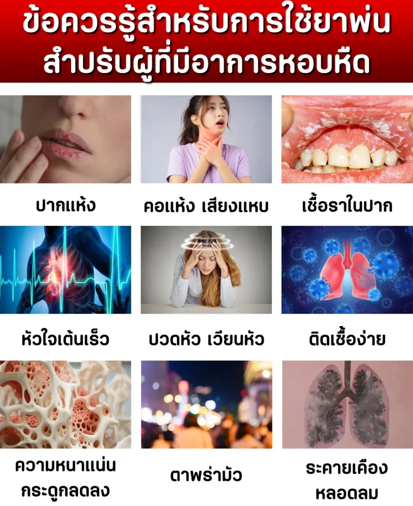 การพ่นยาบ่อย ๆ อาจทำให้เกิดผลข้างเคียง เช่น ใจสั่น ปวดศีรษะ ใจเต้นเร็ว มือสั่น วิตกกังวล ปากแห้ง หรือคอแห้ง