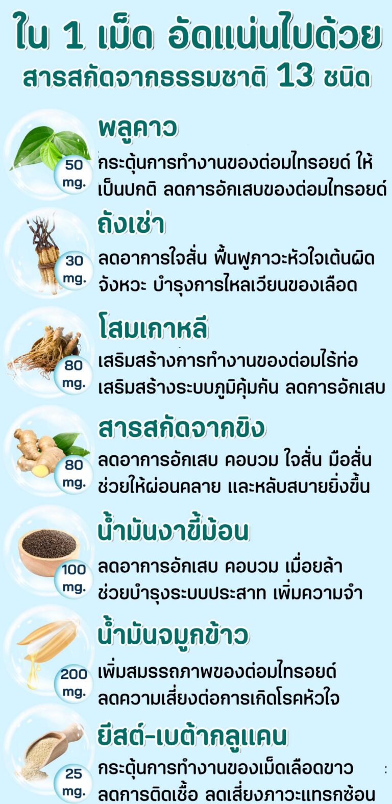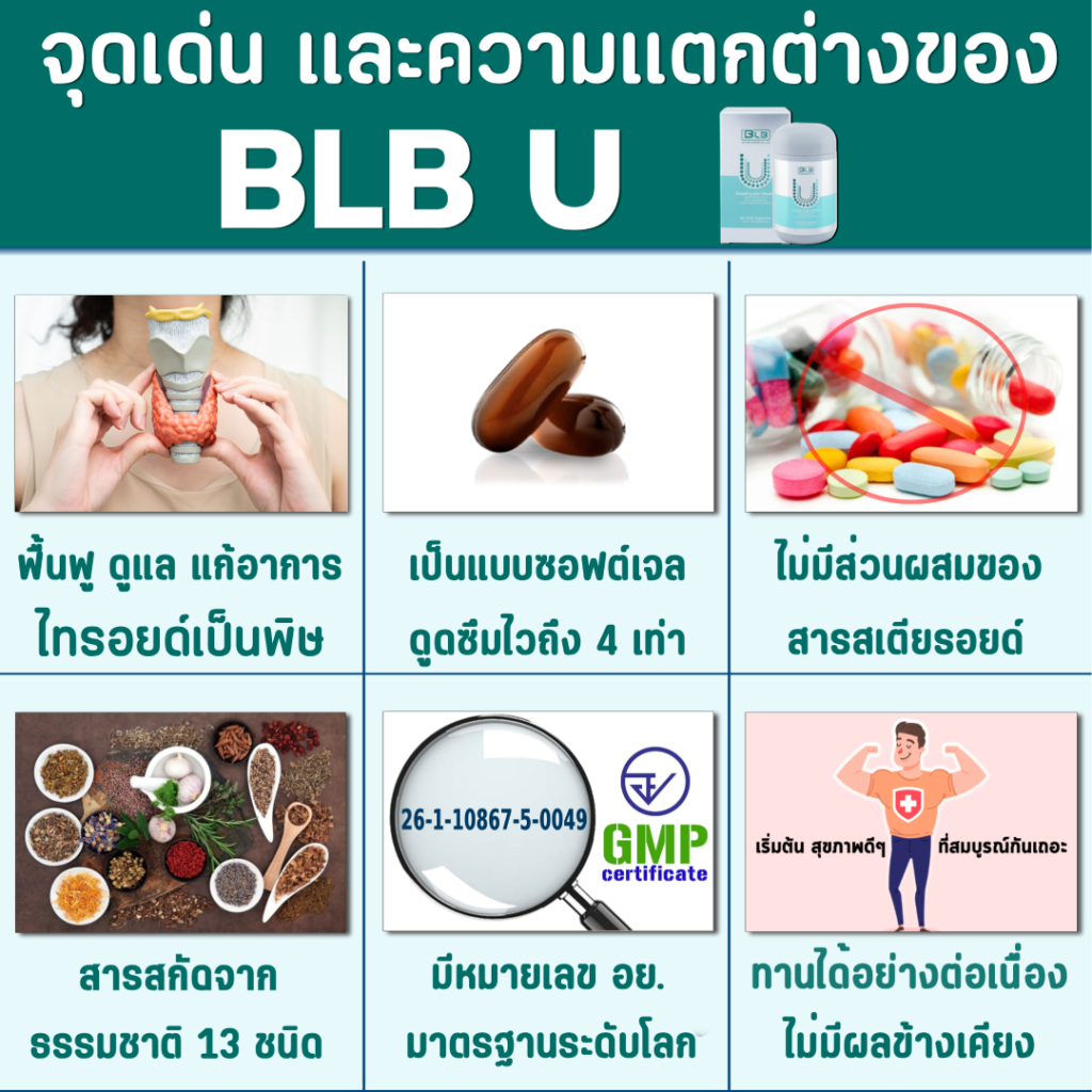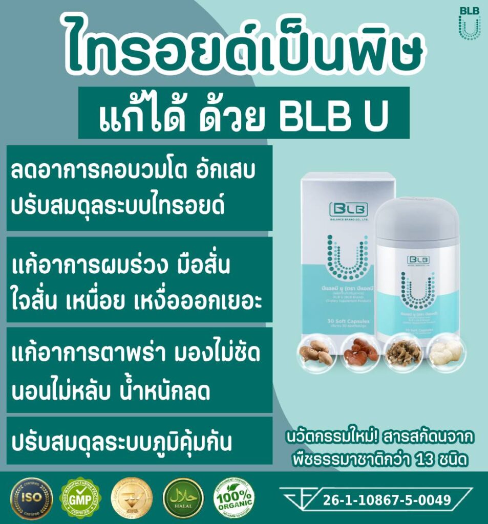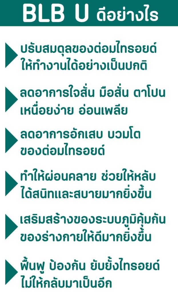 บาลานซ์ บีแอลบี ยู น้ำมันสกัดเย็นจากพืชสมุนไพรธรรมชาติถึง 13 ชนิด ช่วยปรับสมดุลฮอร์โมนไทรอยด์ ไม่ให้มากหรือน้อยเกินกว่าปกติ ช่วยเพิ่มระบบภูมิคุ้มกันในร่างกายที่เป็นหนึ่งในสาเหตุหลักของโรคไทรอยด์เป็นพิษอีกด้วย
